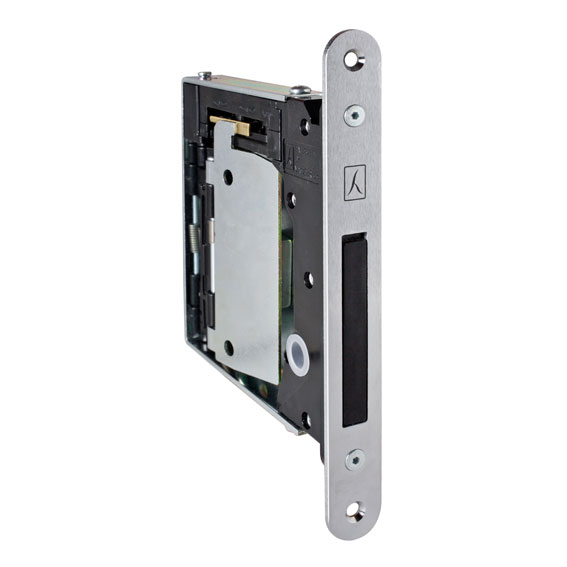Picaporte y un cerrojo magnético en un mismo cajetín, lo que permite abrir y cerrar la puerta sin un picaporte visible.